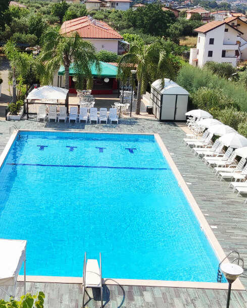 La piscina è dotata di un ampio solarium attrezzato con lettini e sdraio, è composta da una zona bassa per i bambini (1mt. di profondità) e da una zona alta per gli adulti.