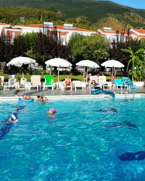 L’accesso in piscina è riservato ai soli clienti del residence ed è gratuito, le villette circondano la piscina.